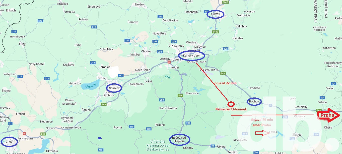 Chcete bydlet v přírodě v dojezdové vzdálenosti od Karlových Varů a pouze 70 min od Prahy? Zajímá Vás malá lokalita nových rodinných domů nebo naopak velký pozemek a individuální stavba? Výrazná variabilita využití pozemku, investiční pozemek? Právě pro Vás nabízíme pozemky o celkové výměře 20.413 m2 na okraji obce Německý Chloumek. Na dotčené pozemky bylo vydáno územní rozhodnutí pro výstavbu 8mi rodinných domů s možností rozšíření až na 10. Na okraji lokality je přípojný bod elektrické energie. Jako zdroj vody jsou navrženy a vybudovány dvě vrtané 30m studny, odkanalizování je řešeno malou domácí čistírnou odpadních vod s přepadem do umělého koryta vodního toku. Dojezdová vzdálenost do Bochova je pouze 5 min, do Karlových Varů 22 min, do Prahy 70 min. Pro bližší informace a prohlídky nás neváhejte kontaktovat.