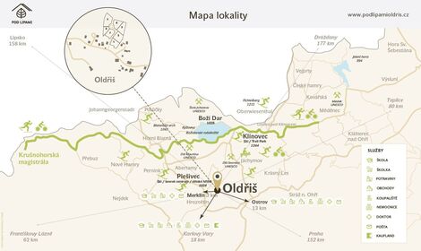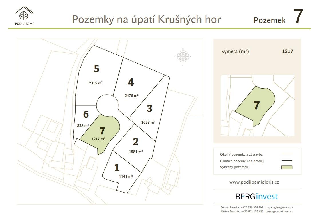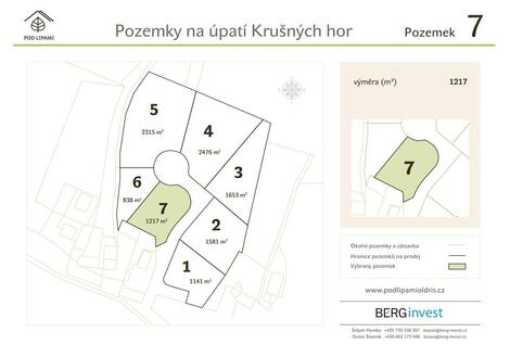 Exklusivně nabízíme poslední 2 kompletně zasíťované stavební pozemky v Krušných horách. Pozemky jsou ideální pro klidné bydlení, investici, či rekreaci. Každý pozemek je jedinečný, přesto tvoří ucelený a velmi příjemný celek. Pozemky se nachází na severním okraji Oldříše, kouzelného místa na úpatí Krušných hor. Ať už hledáte místo pro komfortní rodinný život, anebo pozemek pro vysněný rekreační objekt, projekt Pod Lipami Vás nezklame. Projekt pozemků je šetrným způsobem zasazen do krajiny se vzrostlými stromy, remízky, rybníčkem a výhledy na Krušné hory, Doupovské hory a Slavkovský les. Pro dotvoření podkrušnohorské venkovské idyly byl projekt doplněn nově vysazenými stromy a vzrostlou lípou, jako dominantou uprostřed nově vzniklého kruhového objezdu. Pozemky na výběr: - Pozemek 2 - 1581 m2 - krásný rovinatý pozemek s výhledem na Plešivec, dokončená studna s pitnou vodou - Pozemek 7 - 1217 m2 - rozumný kompromis a skvělá volba pro každého Kompletní informace naleznete na podlipamioldris cz Projekt byl kompletně dokončen a je připraven pro výstavbu vysněné nemovitosti. Pozemky se nachází v území definovaném jako SR plochy smíšené obytné rekreační. Územní plán předpokládá maximální koeficient zastavěnosti 0,2, tzn. na pozemku 1000m2 lze umístit stavbu o zastavěné ploše (půdorysu) 200m2. Maximální výška budoucích objektů je definována jako 2 nadzemní podlaží + obytné podkroví. Součástí projektu je kompletní zasíťování pozemků včetně: - Páteřní příjezdová asfaltová komunikace, - kanalizace, ČOV, - přípojných bodů elektrické energie, - vysokorychlostního internetu. Zdrojem pitné vody jsou soukromé vrtané studny Veškeré služby a infrastrukturu naleznete v nedalekém Merklíně, popřípadě v Ostrově či Karlových Varech. Sportovní vyžití a překrásná příroda je všude okolo Vás. Krušné hory jsou rájem zimních sportů. Ať již Vás vice lákají běžky, snowboard, či sjezdovky, vše je dostupné během pár minut autem. Lokalita je rájem pro cyklisty, toulky přírodou, houbaření, ale i další letní sporty. Z nově otevřeného trail parku na Plešivci dojedete domů skoro bez šlápnutí. V nedalekém Merklíně naleznete lesní přírodní koupaliště napájené vodou z Eliášova potoka. V případě zájmu jsme schopni za pomoci prověřených partnerů asistovat s procesem projektování i realizace. Velmi rádi Vás přivítáme přímo na místě, doporučujeme prohlídku.